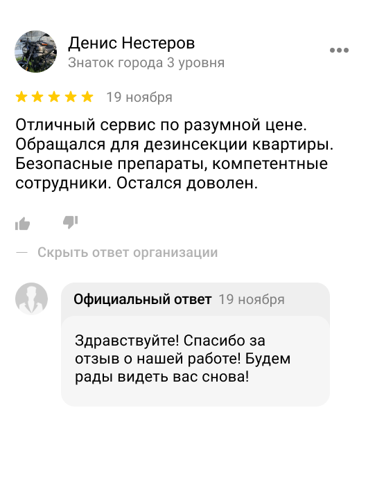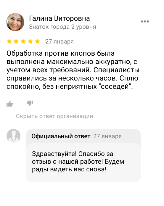 После окончания дезинсекции нужно покинуть помещение на 2-3 часа, после следует проветрить помещение. Нельзя делать уборку и мыть пол в течении нескольких дней. Препарат должен оставаться на поверхностях как можно дольше. Протирать можно, только те поверхности с которыми вы часто взаимодействуйте (дверные ручки, стол, т.д.). Постирайте все вещи на которые мог попасть препарат.